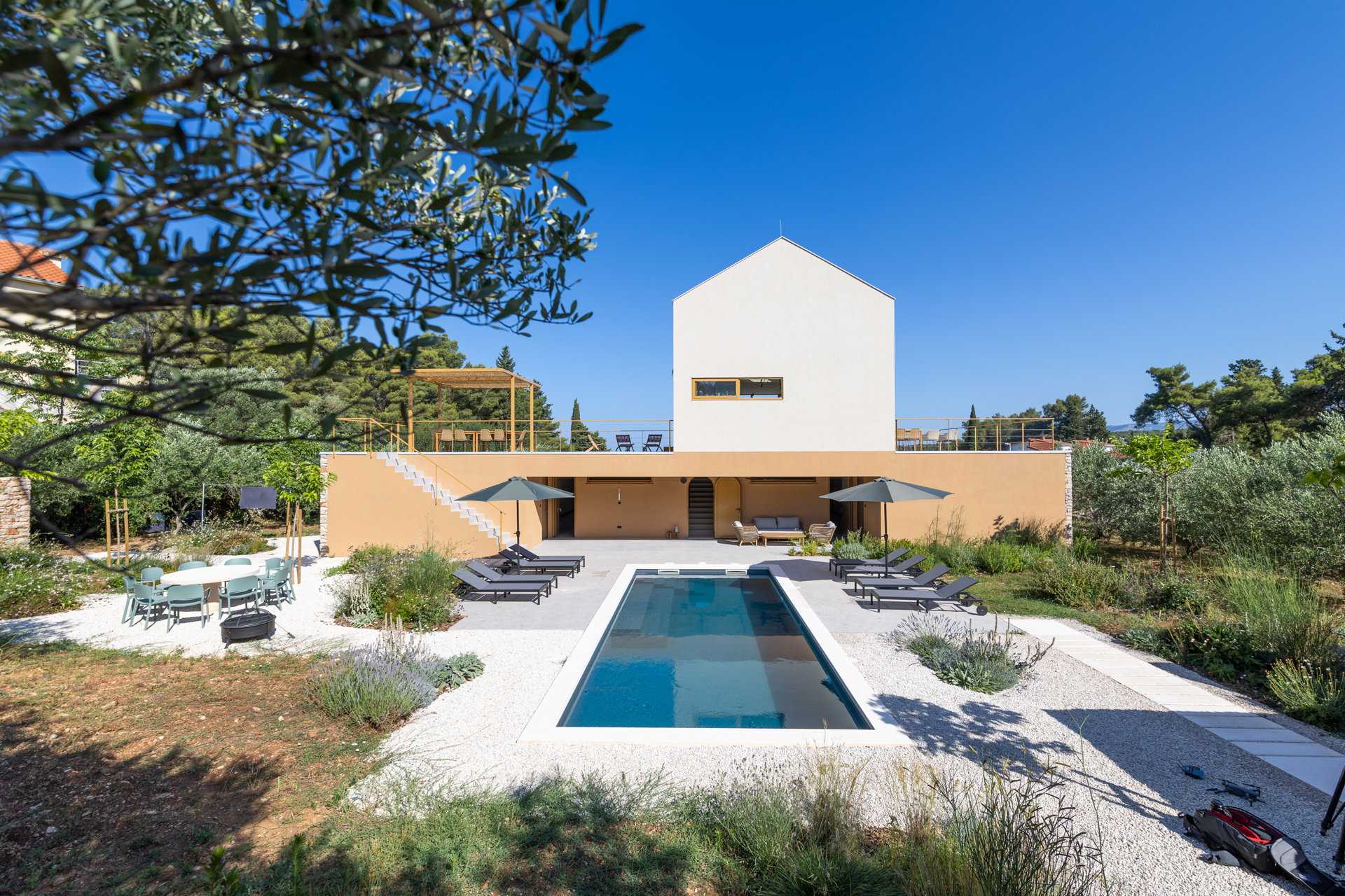 I am a management consultant specialising in heritage and culture. I live in England. I was joint owner of a house in Stari Grad for 12 years. I like it so much there that, on selling the house, I started to look for the best site in the town to build a perfect holiday home. Nine Olives is the result. I, working with local architects Morpharos, have carefully designed it to be a fantastic holiday house for extended families and groups of friends. It has been built by an excellent local construction company. We have combined ultra-modern design with respect for local tradition, especially in the form of dry stone walling on the outside.
