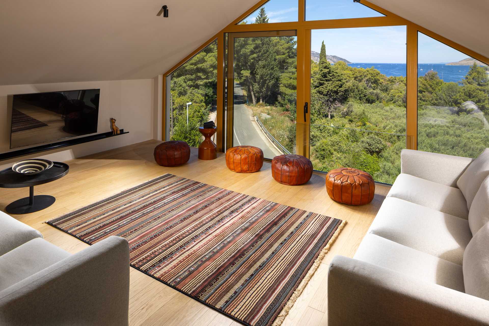 The bedrooms open onto a large veranda and the heated pool, which features a “sitting shelf”. The pool is treated by hydrolysis, with no chemicals. The chapel-style section above is a wonderful space, entirely glazed, with retractable windows, on the sea-facing side. It has an open plan kitchen and dining area, with a round table seating 10. A spiral stair leads to the mezzanine lounge, with even better views. There are two spacious roof terraces.