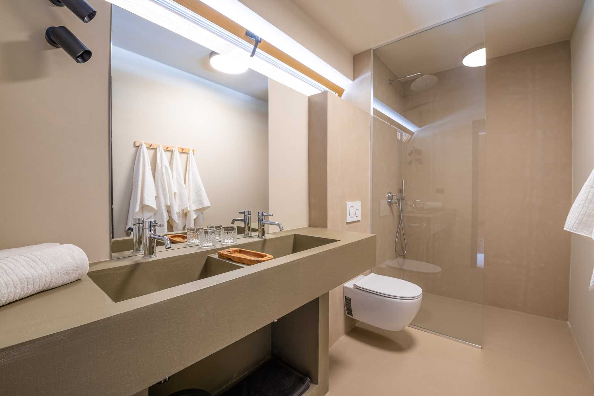 The greatest glory are magnificent sea views, looking direct to the sunset. Four main bedrooms are each the same size and have direct sea views through French windows They each have walk in showers and two basins. The fifth can be a family suite or be used independently. There is a standalone room with bathtub and secluded al fresco shower.